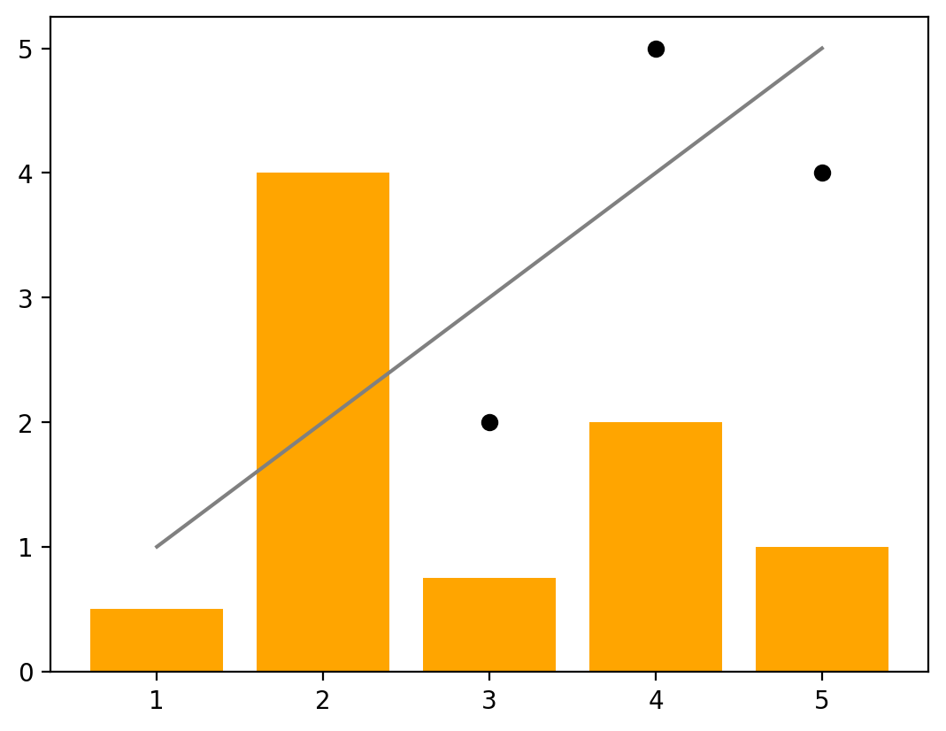The second issue with the plot above is that the order of the plots is not what we prefer since the bar plot is covering up some of the scatter plot points. This is another easy fix that we can make by setting the zorder keyword argument for each plot. Plots with higher zorder values will show up above those with lower zorder values. We’ll set the zorder for the scatter plot to be on top (we’ll set it to 3) and the bar plot to be on the bottom (set it to 1).