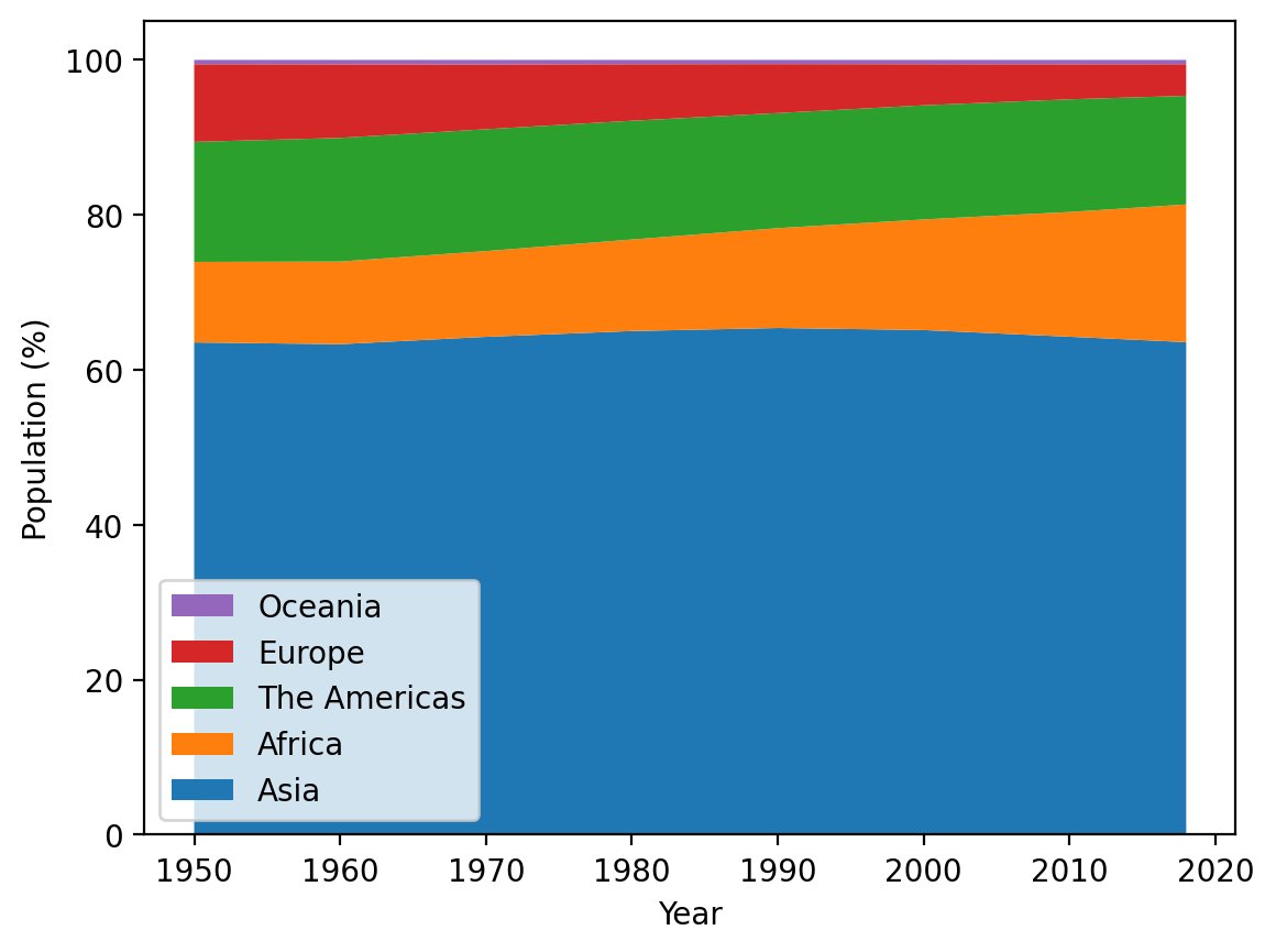 Excellent! One final common use of stackplots is to show percentage breakdowns over time. Let’s update this plot by adjusting the data so that for each year, the data are the percentage contribution to global contribution. This will allow us to more easily see how the shares of population change over time by region.