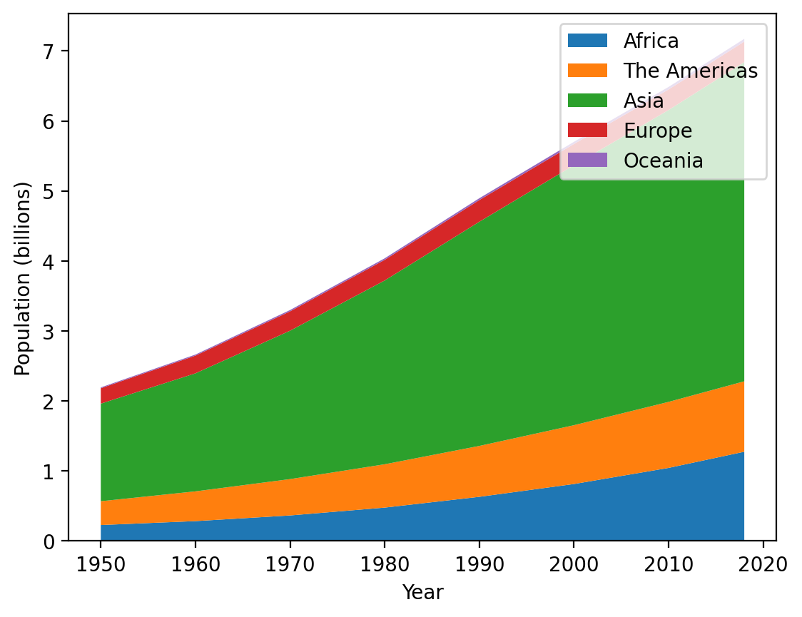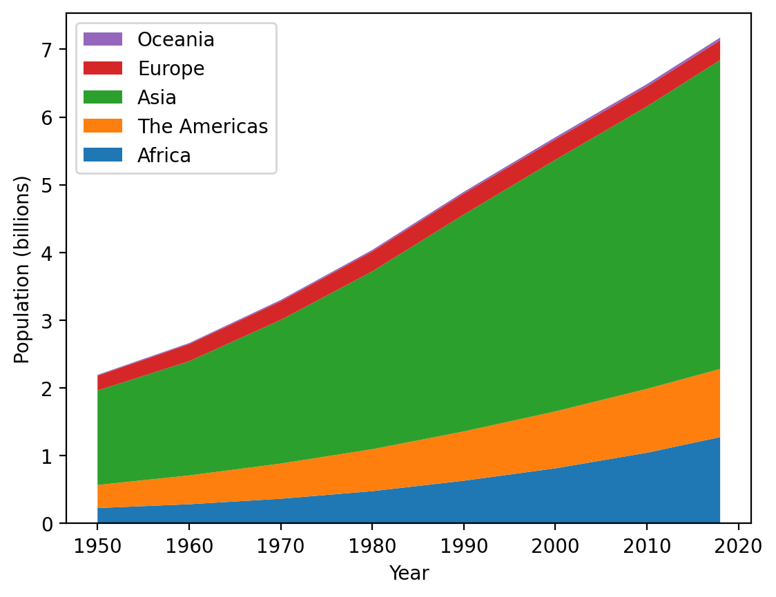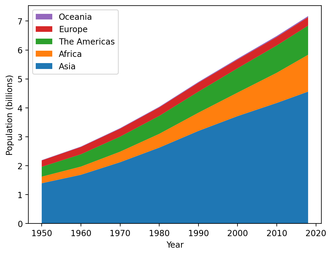 Another common type of plot is a stackplot. This kind of plot is typically a way of displaying multiple series that each represent a quantity in the same units. The contribution of each of the series is “stacked” on top of the other so that the total across all components can be viewed clearly as well as the contribution of each unit. Let’s create some simple data to show how this works. The data below come from the United Nations World Population Prospects (Revision 2019) and was inspired by this demo in the matplotlib gallery. Population is provided in billions of people.