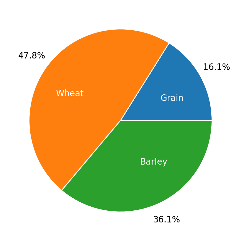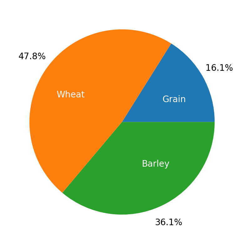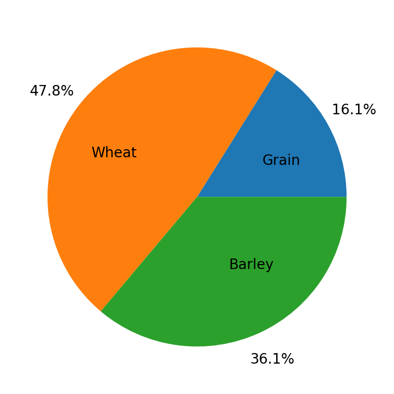 Maybe we want the name of the grain inside the plot and the percent outside the plot. We can adjust this with two keyword arguments: pctdistance, which is the relative distance along the radius of the pie where the text created by autopct is located. The edge of the pie chart is a distance of 1, so anything larger than 1 is outside the chart and anything smaller than 1 is inside the chart. There’s an analogous keyword argument for the label, labeldistance. Let’s adjust those to see how we can swap the text locations.