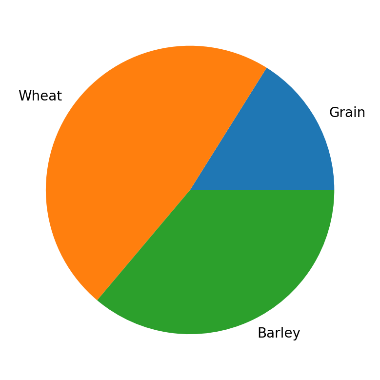 Pie charts are, thankfully, quite easy to make in matplotlib. Let’s revisit our example of the total grain, wheat, and barley across the three farms that we discussed in a previous lesson and plot the percentage of each that is present. Recall here that the index of the total series is the names of the types of crops.