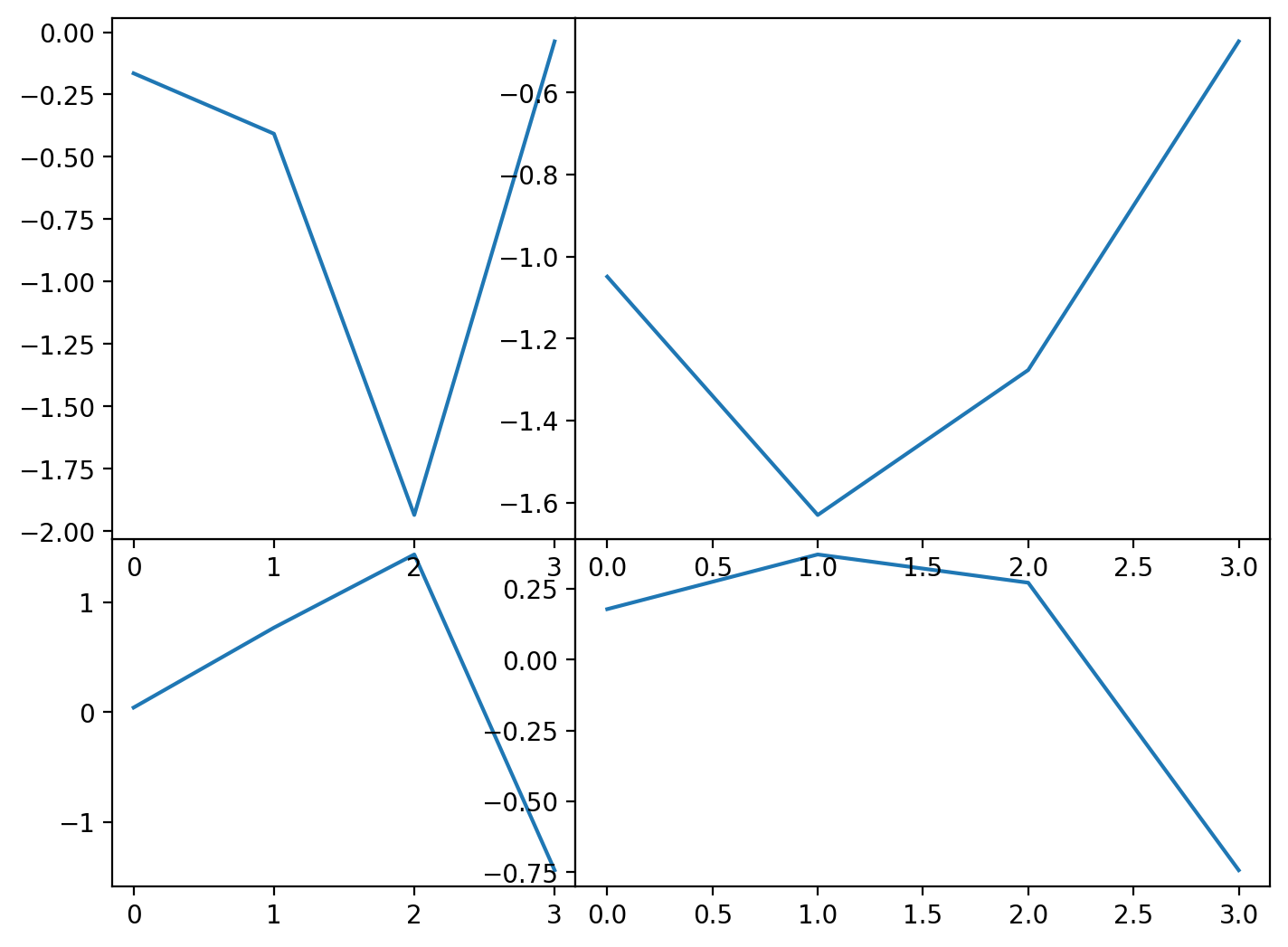 We can create our own custom subplots in this way. Consider this example where we break the figure into four quadrants. We need to specify the bottom-left corner of each axes we want to add and its width and height. We’ll follow this pattern for it: