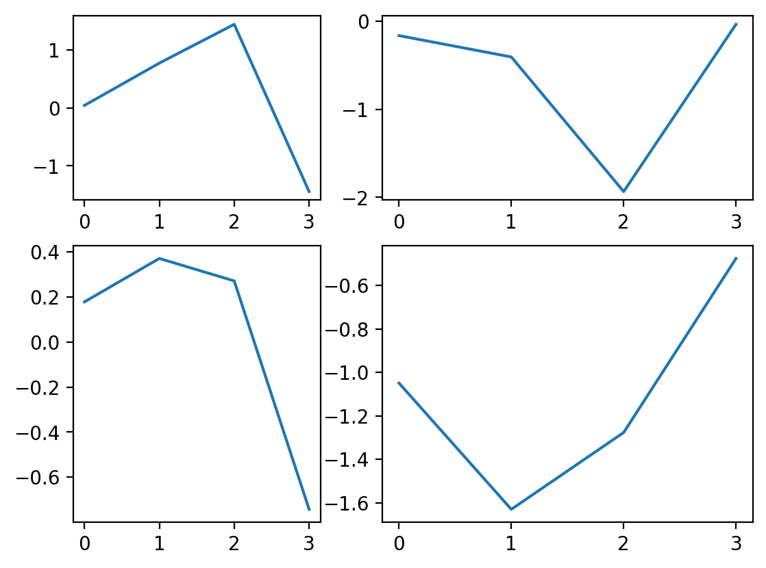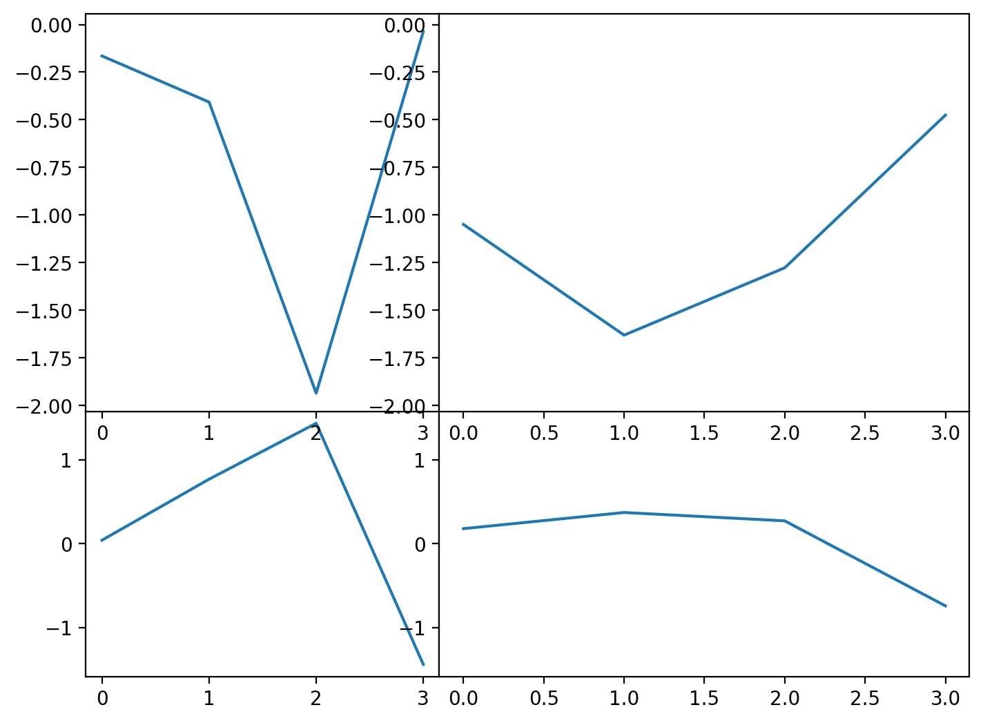 One additional feature of subplots() is that you can set the axes to be shared of, for example, the y axes were the same across the two top figures and also across the two bottom figures. To do this, we use the sharey keyword argument and tell it to share across rows.