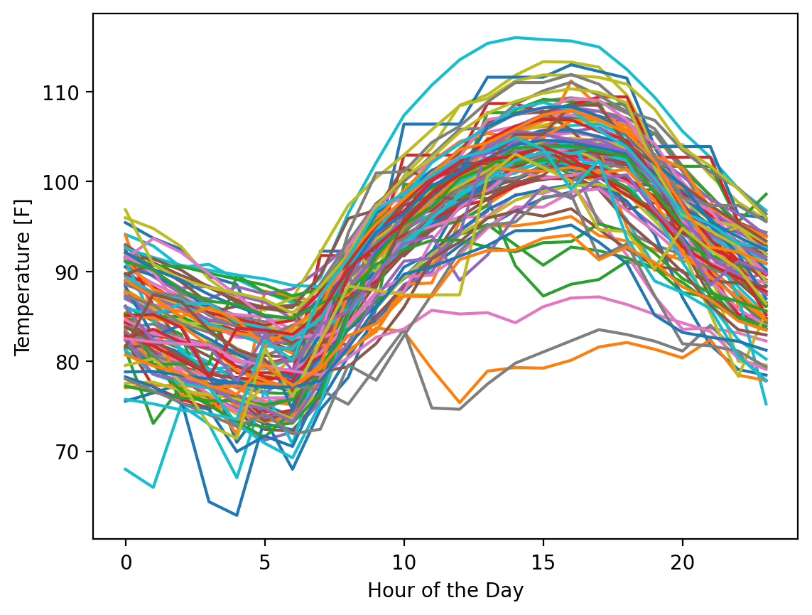 We can already see that maximum temperature in 2013 was 116 degrees - ouch! To get a sense for the variability in the values, let’s plot every 24 hour period as a single time series in a plot. Since June has 30 days and July and August have 31 days, there will be 92 separate plots involved.