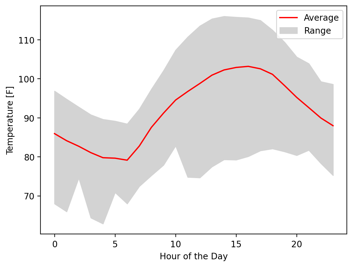 Visualizing errors and ranges are a common need in data science. We often find ourselves in situations where there is some inherent uncertainty in our data and the information we’re presenting is an estimate with some likely error. Similarly, we can sometimes find ourselves wanting to visualize average values along with the smallest ever seen or the largest ever seen to know by how much a quantity could vary. For example, imagine that you wanted to plot the mean hourly temperature and want to see what was the highest and lowest ever experienced on that day in a given year.