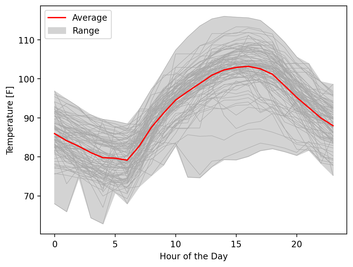 Obviously, this is a data visualization mess and you should never plot this many lines on one plot if there was a goal to understand something about individual lines, but fortunately, that’s not our interest here. We want to know what the range of possible values are across this period. Let’s calculate the mean, minimum, and maximum for every hour of the day across all 92 days: