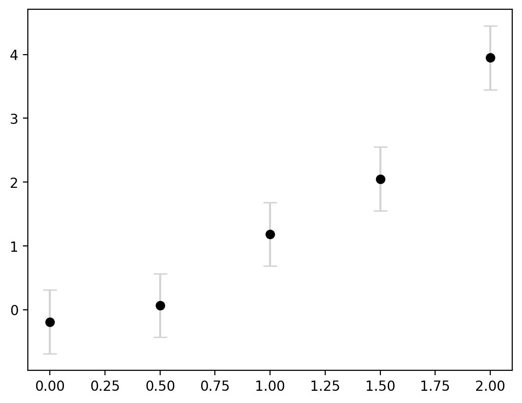 Let’s say these data represented model outputs and we had evidence to demonstrate that 95% of the time the true value fell within 0.5 units of the true estimate. We can communicate this using the errorbar method: