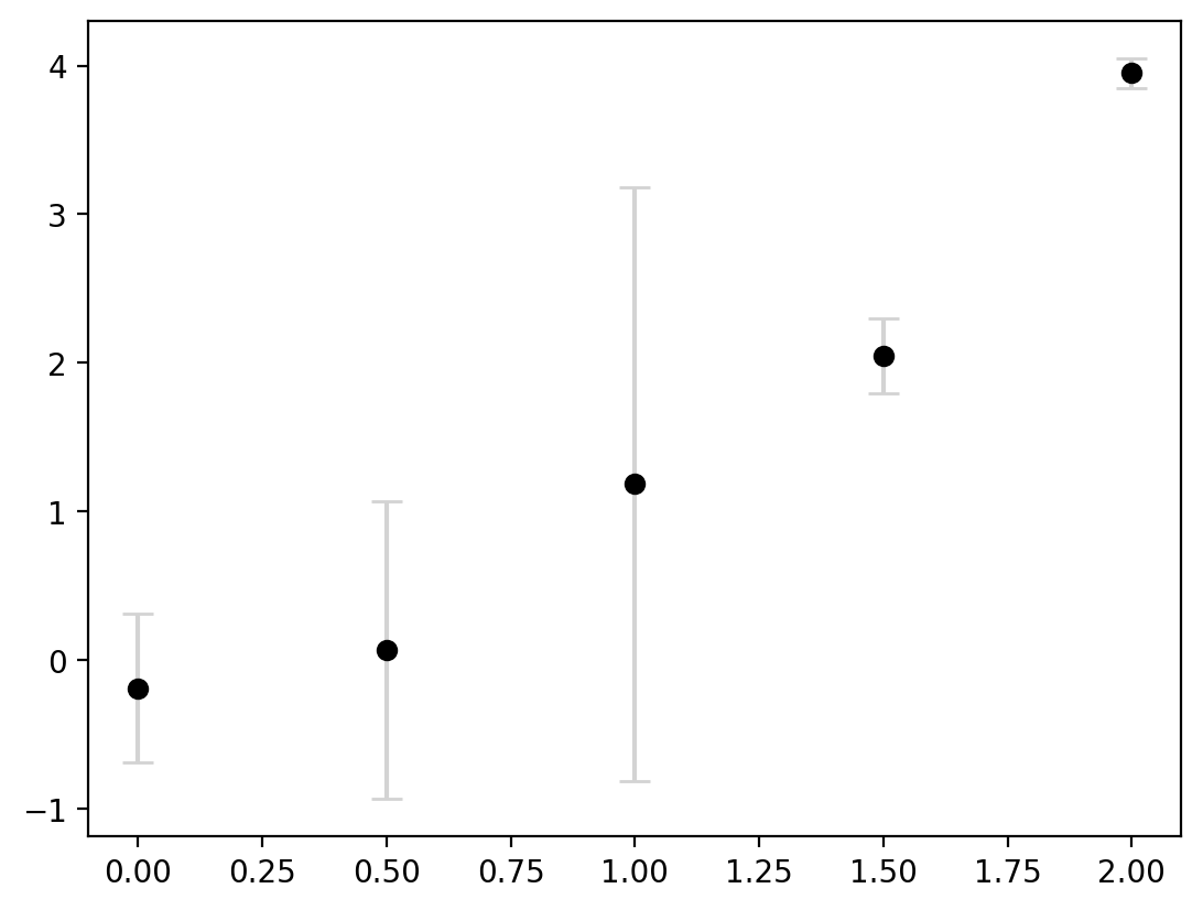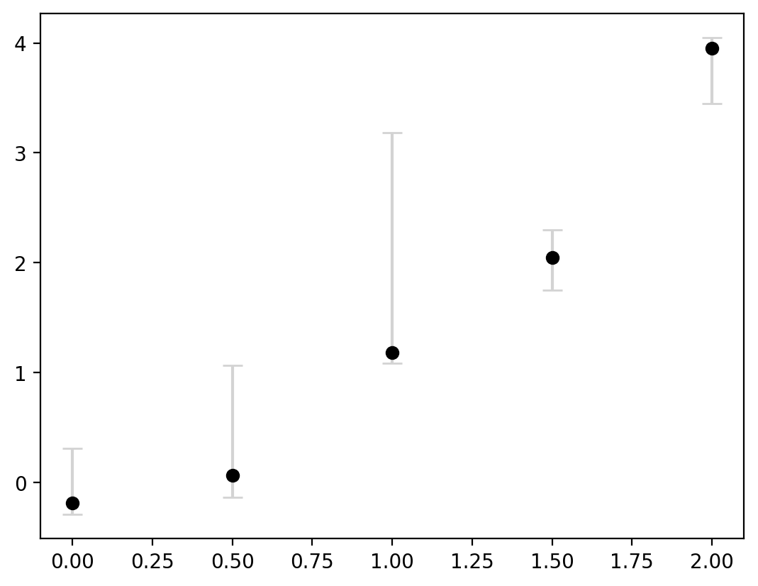 This now clearly communicates that there are different levels of certainty around each estimate. Lastly, the errorbars are not always symmetric. We can do this by inputting a 2D array for yerr where there are two entries for every value in y.