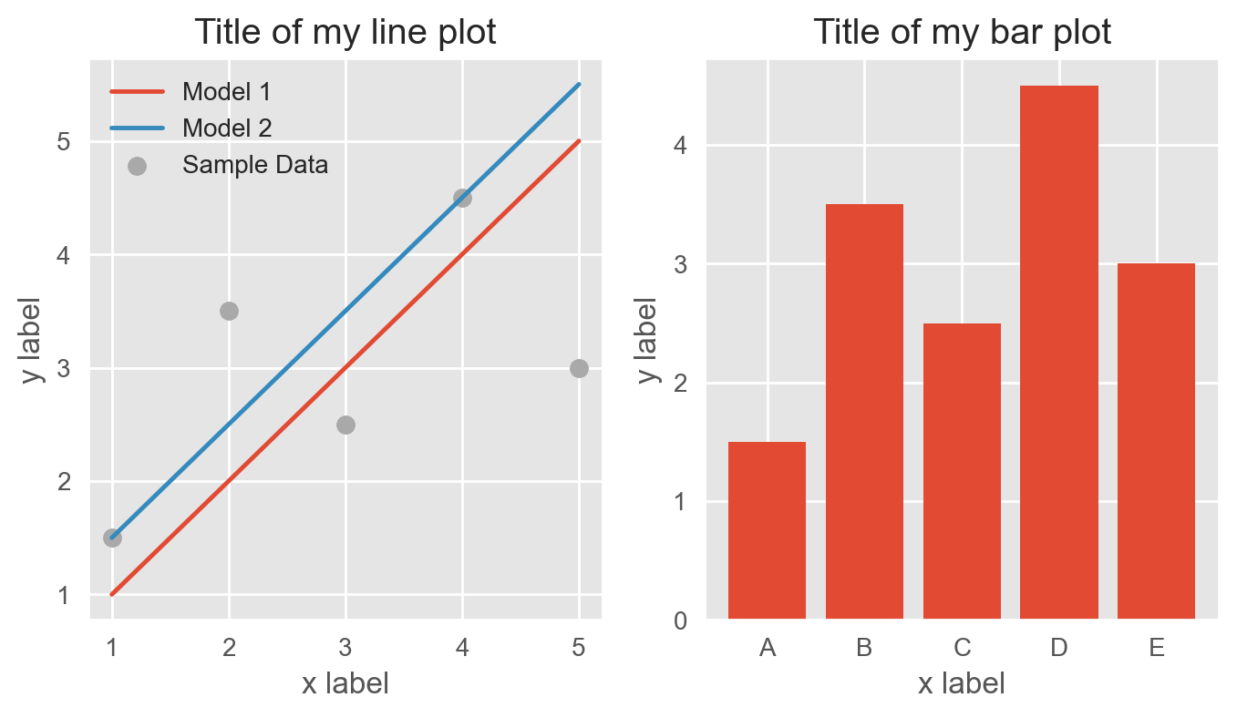 Before we start, let’s take a subplot plot with two subplots containing a line/scatter plot and a bar plot. In its initial state, it is a perfectly acceptable plot where all of our data are correctly represented in a form that suites them and all the content in our plot is fully labeled to be able to facilitate interpretation (satisfying questions 1 and 2 above with a resounding “yes”). The only style that was added was to change the color of the scattered data to distinguish it from the plot data (otherwise they are plotted in the same color).