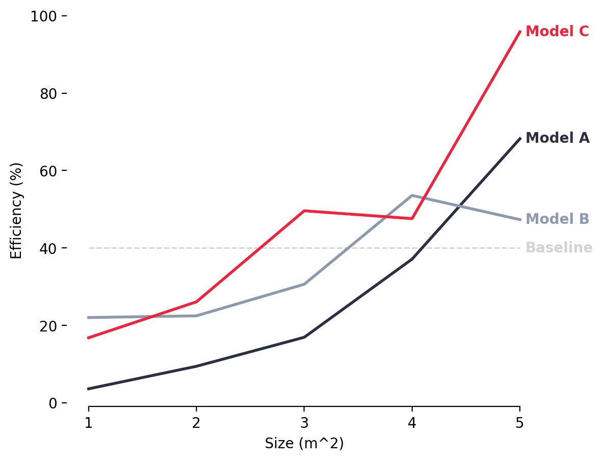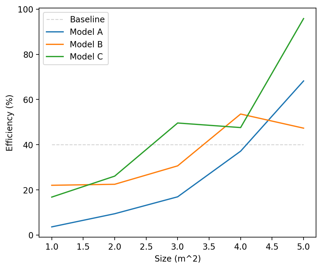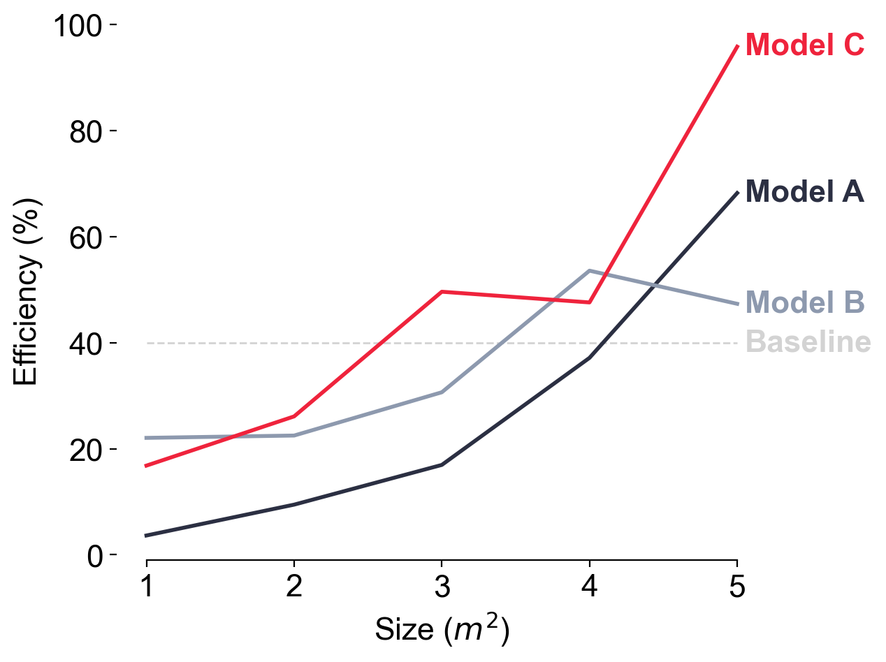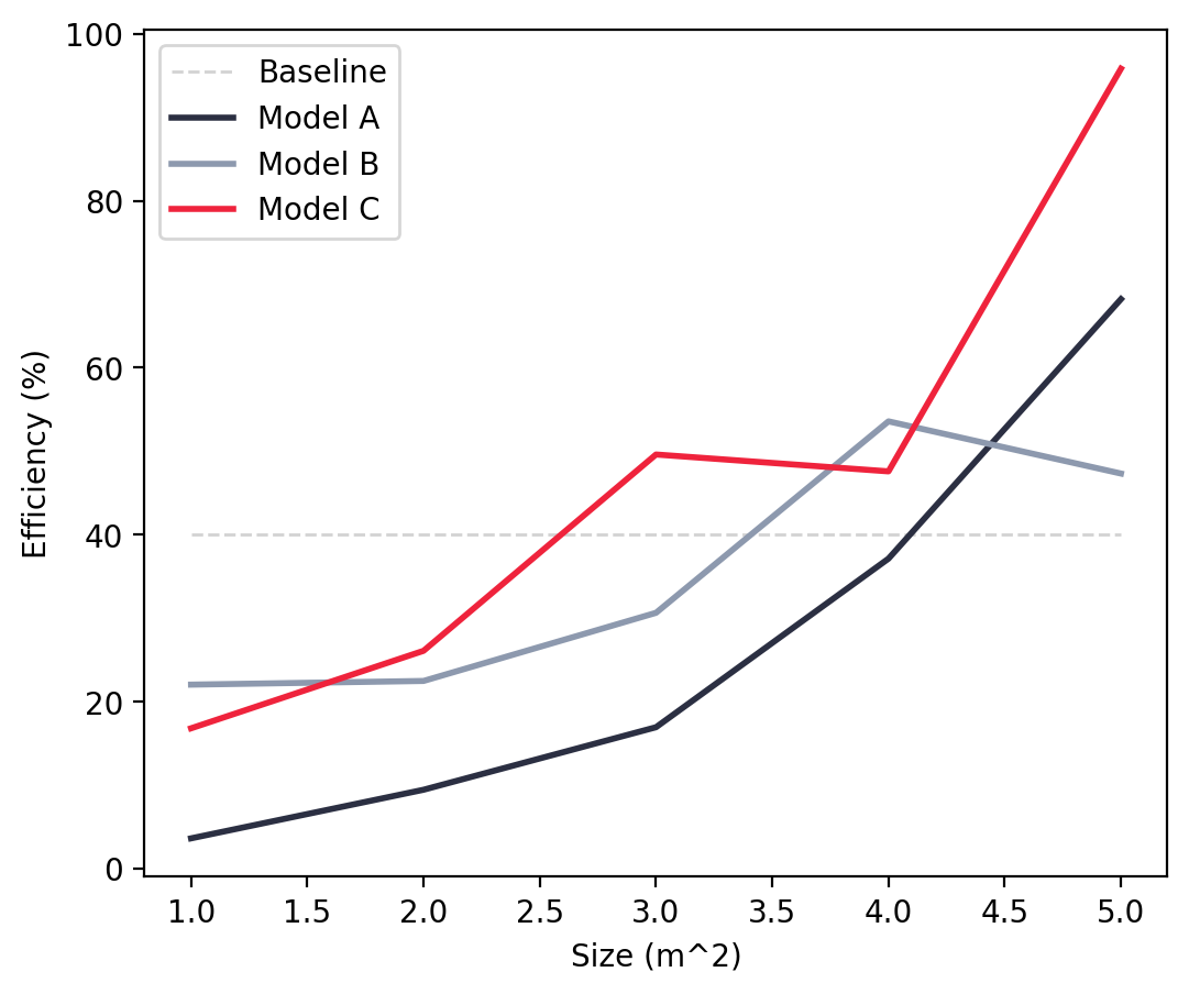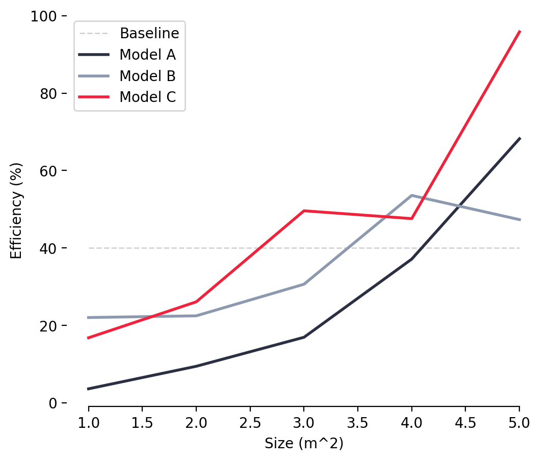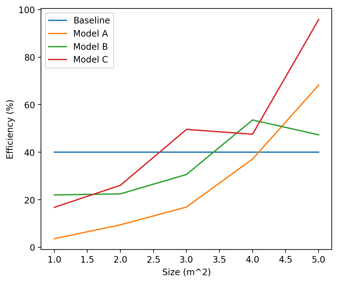 Let’s begin with our data from the last lesson which is performance data for three different models: Model A, Model B, and Model C. Each model takes as input an area parameter we want to plot the efficiency of each model across the possible values of size. There is also a baseline value of 40% efficiency for the previous best model that is meant for comparison.