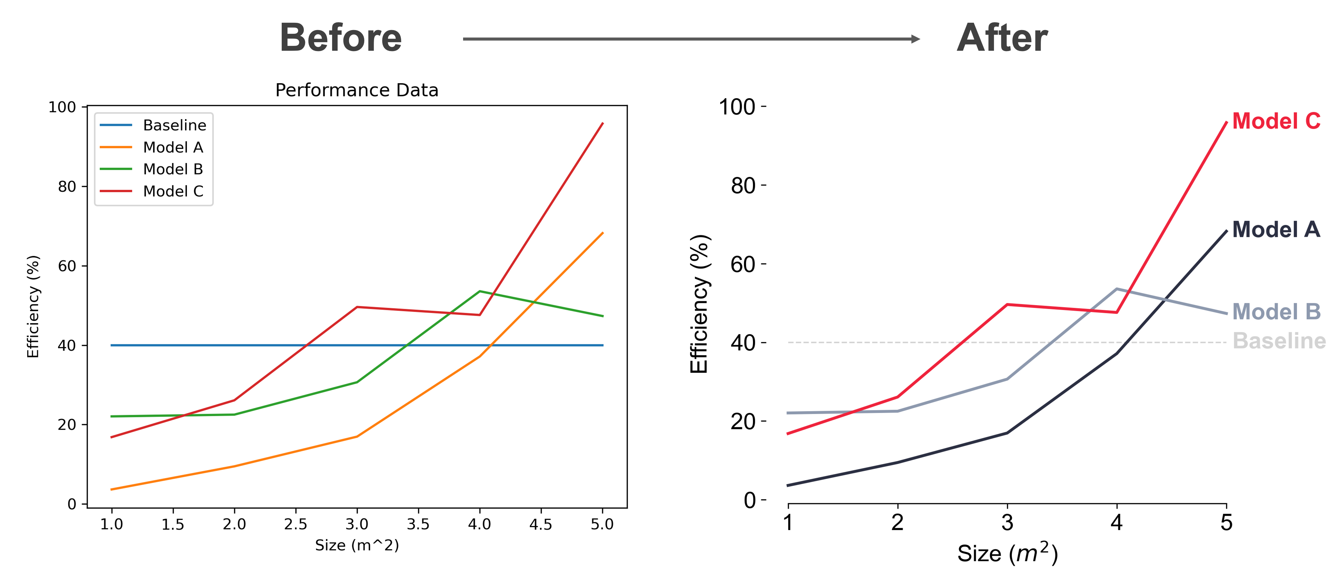 The line colors in this plot are pretty random and don’t distinguish between the other lines. In some cases that may be fine if there is no reason why any one line should stand out from the rest, but for our case, we want to emphasize the top performing model (Model C) and distinguish it from the rest. This can be easily accomplished by making one line a strong color, like red in this case, and using different shades of another color to group the rest (grey in this case), causing the line we’re trying to emphasize to pop out.